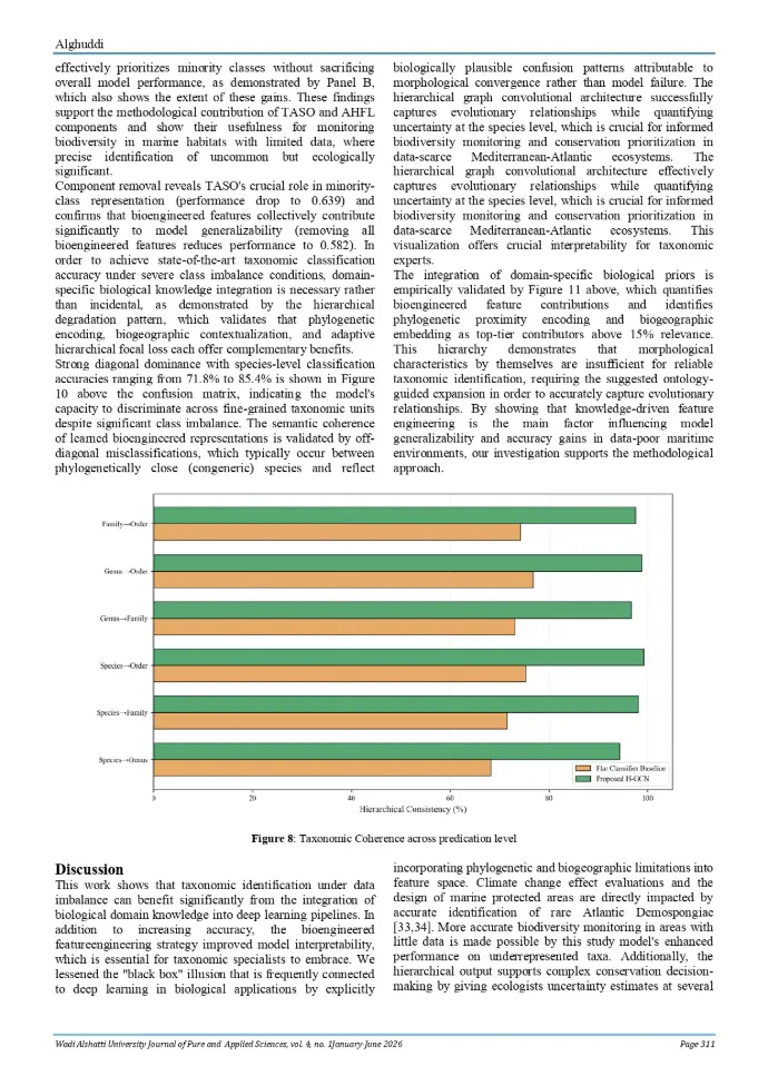 تتناول الدراسة تحديات التصنيف الآلي للإسفنج البحري (Demospongiae) الناتج عن التشابه الشكلي ونقص التوازن الحاد في البيانات الإقليمية. قدمت الباحثة إطاراً حسابياً يدمج التعلم العميق مع هندسة الميزات المستندة إلى أسس بيولوجية لتصنيف 503 عينات من البحر المتوسط والأطلسي. تضمن العمل بناء مسار للميزات يشمل المعلومات المورفولوجية، البيئية، والتطورية المستمدة من هياكل علم الإسفنج. ولمعالجة انحراف توزيع البيانات عبر الرتب التصنيفية، طُبقت استراتيجية هجينة تشمل أخذ عينات زائدة اصطناعية وفقدان التركيز الهرمي. استُخدمت شبكة عصبية تلاقيفية بيانية (H-GCN) لتعلم العلاقات التصنيفية مع الحفاظ على القيود الهرمية. أظهرت النتائج تفوقاً كبيراً على النماذج التقليدية، حيث حققت دقة (F1) بلغت 0.89 على مستوى الرتبة و0.76 على مستوى النوع. كما سجل النموذج تحسناً ملحوظاً في استرجاع بيانات الأنواع الأطلسية الأقل تمثيلاً. وأثبتت تحليلات الاستبعاد أن دمج الميزات المهندسة حيوياً يعزز بشكل كبير من قدرة النموذج على التعميم. تساهم هذه الدراسة في أتمتة إجراءات التصنيف بما يدعم رصد التنوع البيولوجي البحري بكفاءة أعلى. ويقدم البحث منهجية قابلة للتكرار لدمج الخبرات البشرية في أنظمة التعلم العميق المتخصص.