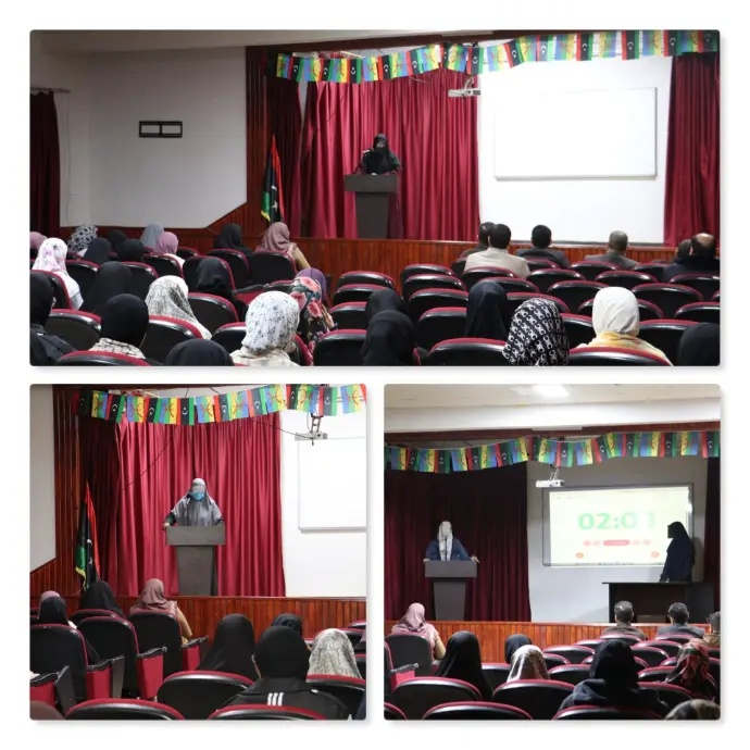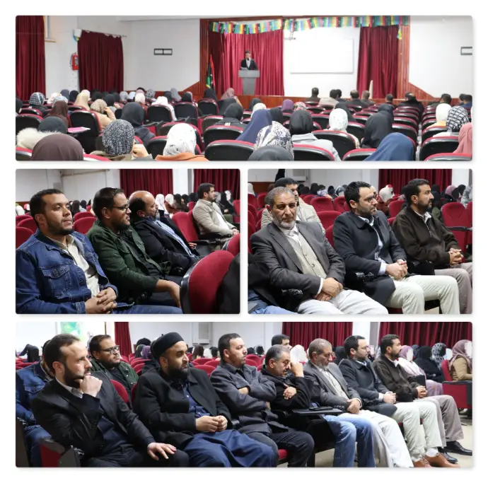 وموظفي الكلية. ونوّه العميد في كلمته بأهمية اللغة العربية كوعاء للفكر وأداة حيوية لتعزيز المعرفة، مؤكداً على دور الكلية في تعليم اللغة وغرس الاعتزاز بها في نفوس الطلبة، كما شجع باقي الأقسام العلمية لإقامة نشاطات تخص تخصصاتهم وتوجهاتهم. تلا ذلك كلمة رئيس قسم اللغة العربية الذي سلط الضوء على مكانة اللغة العربية العلمية والأدبية، ودور القسم في إحيائها من خلال المناهج الدراسية والأنشطة اللامنهجية. مداخلات تربوية وثقافية أثرت المفتشة التربوية الأستاذة نادية عسكر الحفل بكلمة أكدت فيها على الدور المحوري للغة العربية في تشكيل العقلية الناقدة والإبداعية لدى الطلبة، وضرورة ربط التقدم التكنولوجي بالهوية اللغوية. كما قدمت الأستاذة ربيعة يوسف يحمد، مدرسة اللغة العربية في التعليم العام، لمحة عن مكونات اللغة وإمكاناتها في عصر العولمة والتقنيات الحديثة، وذلك بحضور كوكبة من إدارة التفتيش التربوي بنالوت وهنّ: