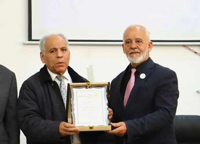 وفي لفتة تقديرية ، قام السيد رئيس أكاديمية الرشيد بتقديم "درع التميز" للسيد رئيس جامعة نالوت ؛ تعبيراً عن الامتنان لدوره القيادي ورعايته الكريمة ودعمه المستمر لمسيرة التدريب والتطوير بالجامعة.