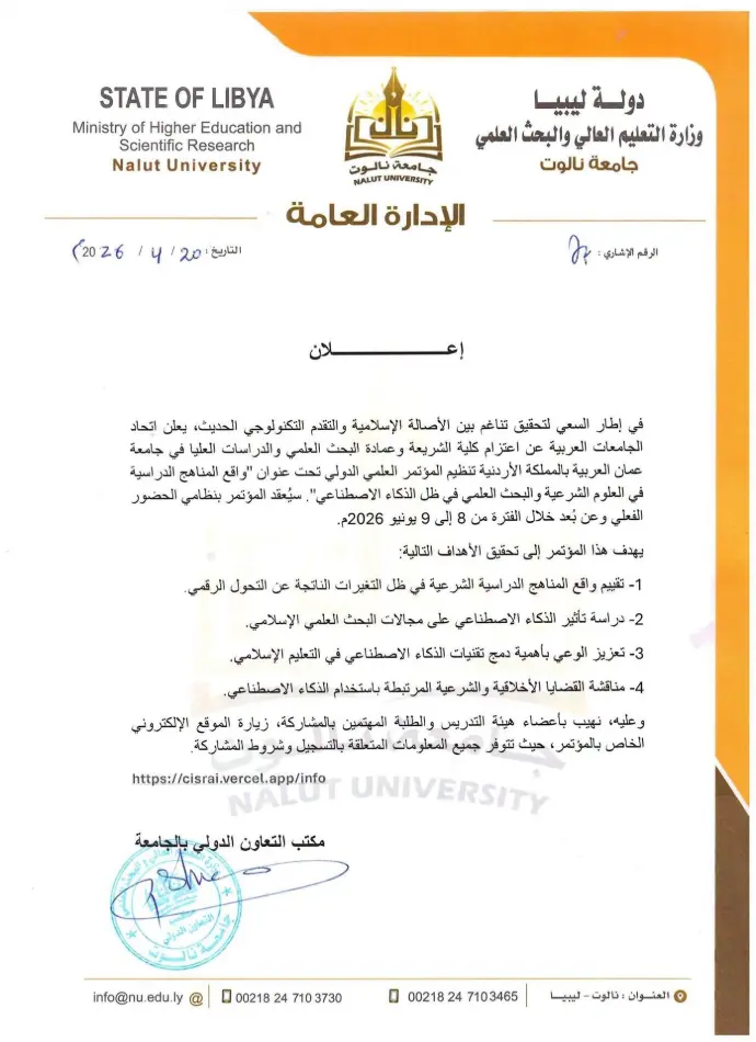 #Nalut_University#International_Cooperation_Office #Invitation_to_Participate #Scientific_Research #International_Conferences