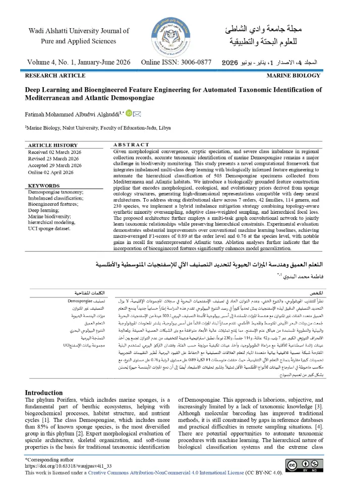 كلية التربية جادو ،جامعة نالوت تعزز حضورها في المجلات العلمية المحكمة ببحث متميز حول تصنيف الإسفنج البحري بتقنيات التعلم العميق