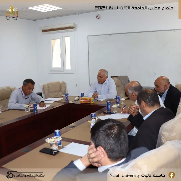 برئاسة السيد رئيس جامعة نالوت أ.د محمد مسعود قنان وبحضور كافة السادة بمجلس الجامعة عُقد صباح يوم الأحد 5 مايو 2024م بقاعة الاجتماعات بالإدارة العامة للجامعة، اجتماع مجلس الجامعة الثالث للعام 2024م.