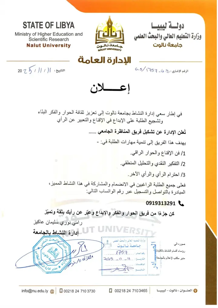 إعلان هام للطلبة: انضم إلى فريق المناظرات الجامعي! في إطار سعي إدارة النشاط بجامعة نالوت لتعزيز ثقافة الحوار البناء وتشجيع الطلبة على الإبداع في الإقناع والتعبير عن الرأي، تعلن الإدارة عن تشكيل فريق المناظرات الجامعي. - أهداف الفريق: يهدف هذا الفريق إلى تنمية مهارات الطلبة في المجالات التالية: 1. فن الإقناع والحوار الراقي. 2. التفكير النقدي والتحليل المنطقي. 3. احترام الرأي والرأي الآخر. - كيف تنضم إلينا؟ ندعو جميع الطلبة الراغبين في الانضمام والمشاركة في هذا النشاط المميز، إلى المبادرة بالتواصل والتسجيل عبر رقم الواتساب التالي: رقم التواصل (واتساب): 0919313291 كن جزءًا من فريق الحوار والإبداع وعبر عن رأيك بثقة وتميز. مع تحيات إدارة النشاط بالجامعة