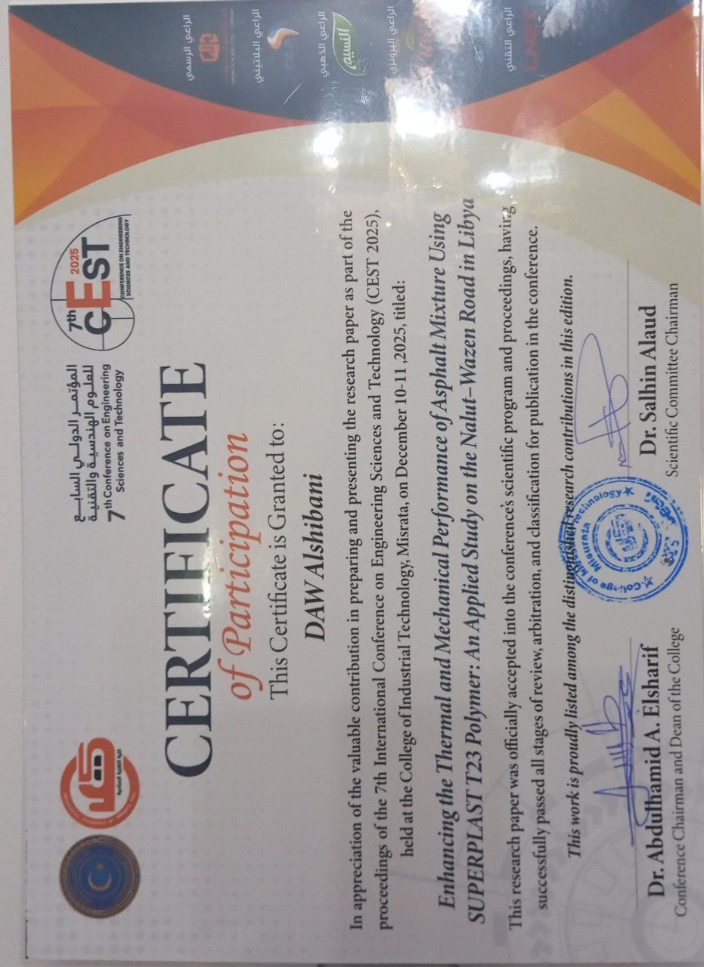 Summary: An important applied study aimed at improving the thermal and mechanical performance of asphalt mixtures using the polymer material SUPERPLAST T23, with a practical application on the Nalut-Wazin road in Libya.